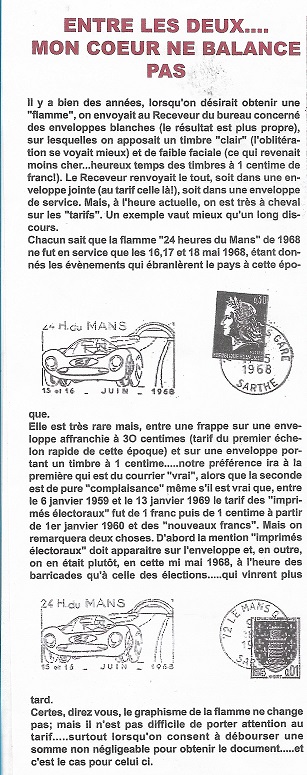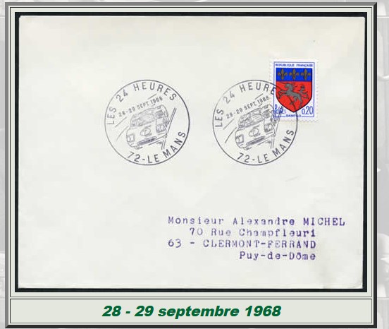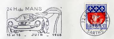 AUTOMOBILE - La flamme moderne LA PLUS RARE ! Celle des 24 H DU MANS, 36e édition 1968. Flamme de promotion postale illustrée d'une voiture de course "24H DU MANS - 15 et 16 JUIN 1968" avec oblitération mécanique machine SECAP. La course initialement prévue fut annulée suite aux évènements de MAI 1968 et repoussée à l'automne (week-end des 28/29 septembre 1968). Cette flamme ne fut en service au bureau "Le Mans-gare" que 3 jours (dates connues : les 16, 17 et 18 mai).