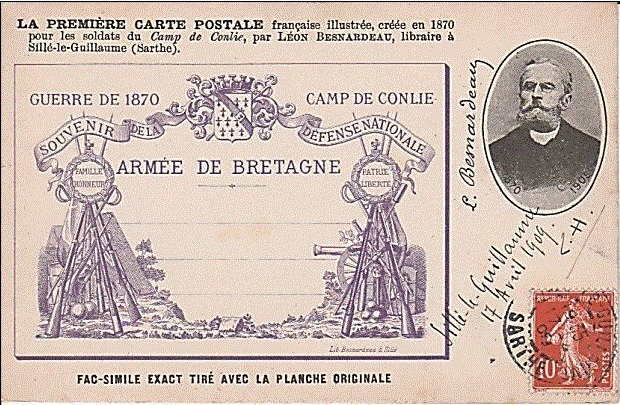 C'est Léon BESNARDEAU ( 1829-1914) libraire à Sillé Le Guillaume qui inventa la première carte postale pour la correspondance.