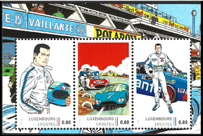C'est un bloc de trois timbres poste du Luxembourg à l’effigie de Michel Vaillant enchâssés sur une carte avec une image extraite de la BD éponyme.