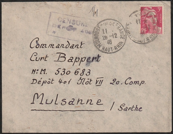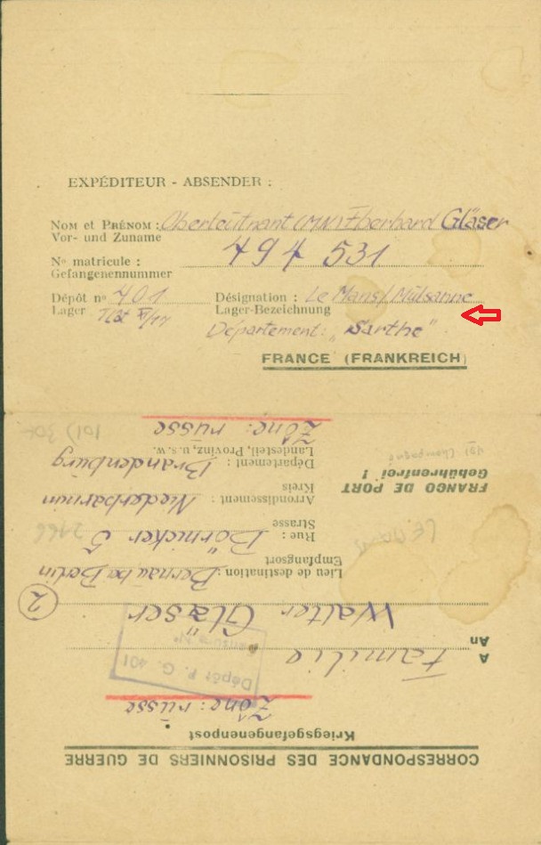 Ce camp passe sous le contrôle de l' armée française le 6 juillet 1945 sous le nom de PGA 402 . " Lettre envoyée par un prisonnier allemand à destination de l' Allemagne"