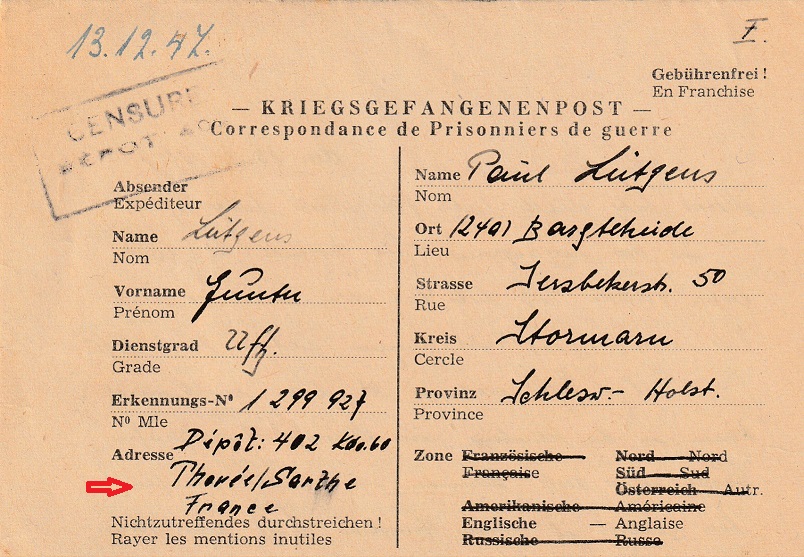 Lettre envoyée depuis ce camp Kriegsefanenpost 13-12-1947 Dépôt P.G THOREE LES PINS Bergheide