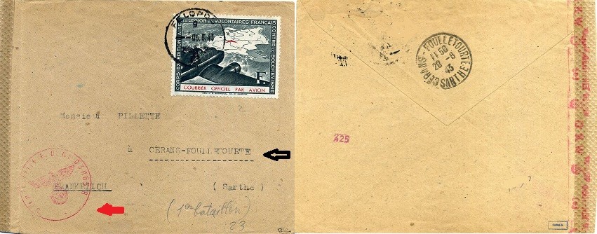 Légion Volontaire Française contre Le Bolchévisme Lettre oblitérée FELDPOST le 5/06/1943 Censure & CS N° 03865A à destination de CERANS- FOULLETOURTE